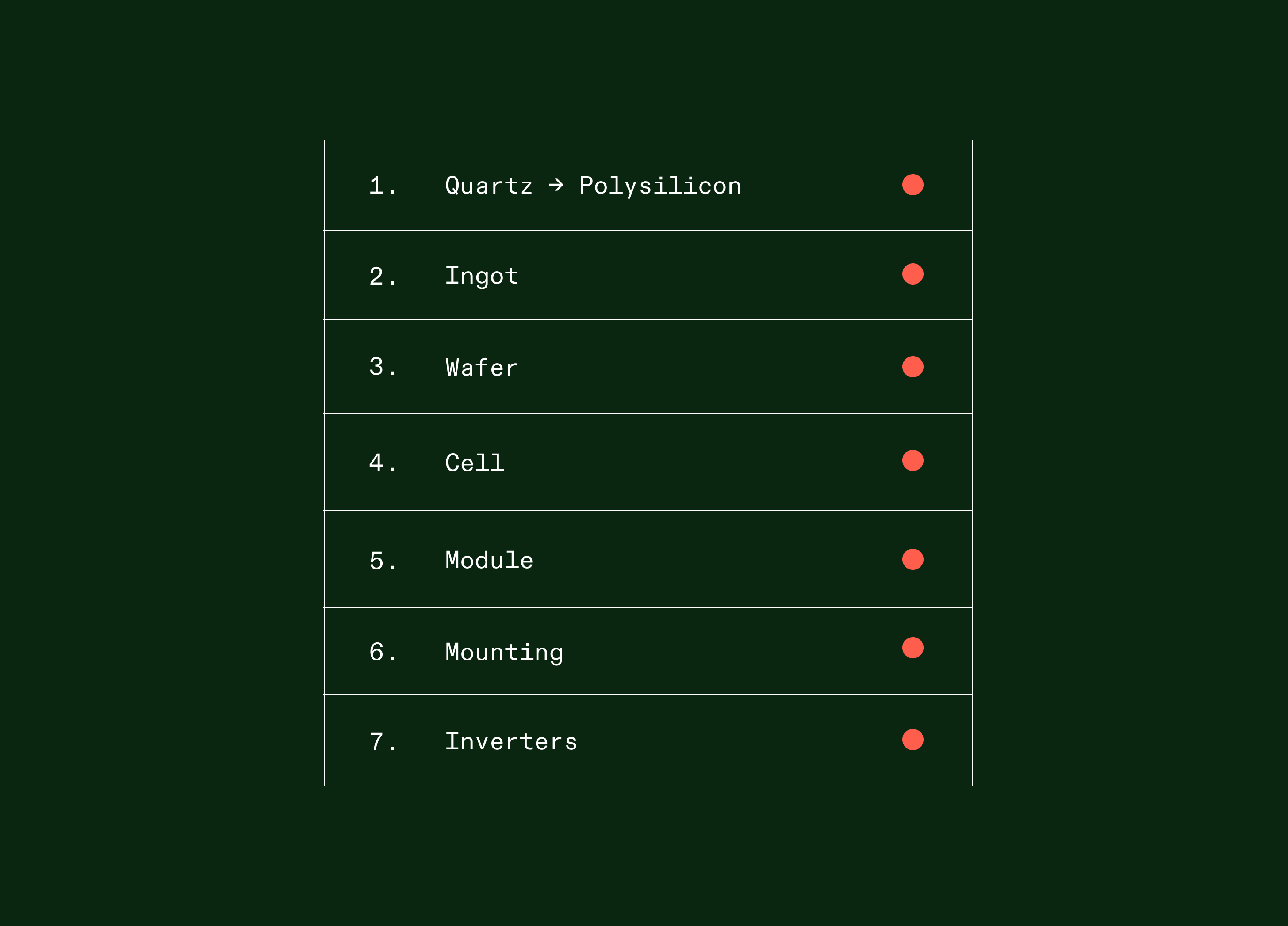 Based on the U.S. DOE Solar Photovoltaics Supply Chain Deep Dive Assessment (Treasury compliance still pending), we’ve outlined key supply chain components that may be required for diligence under the new FEOC guidelines: